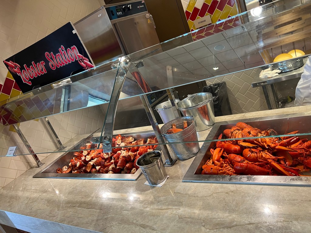 They have a lobster station, seafood station, carving station, international which consists of All American, Italian, and I believe Asian. In the middle of the restaurant is a salad bar and desserts station.