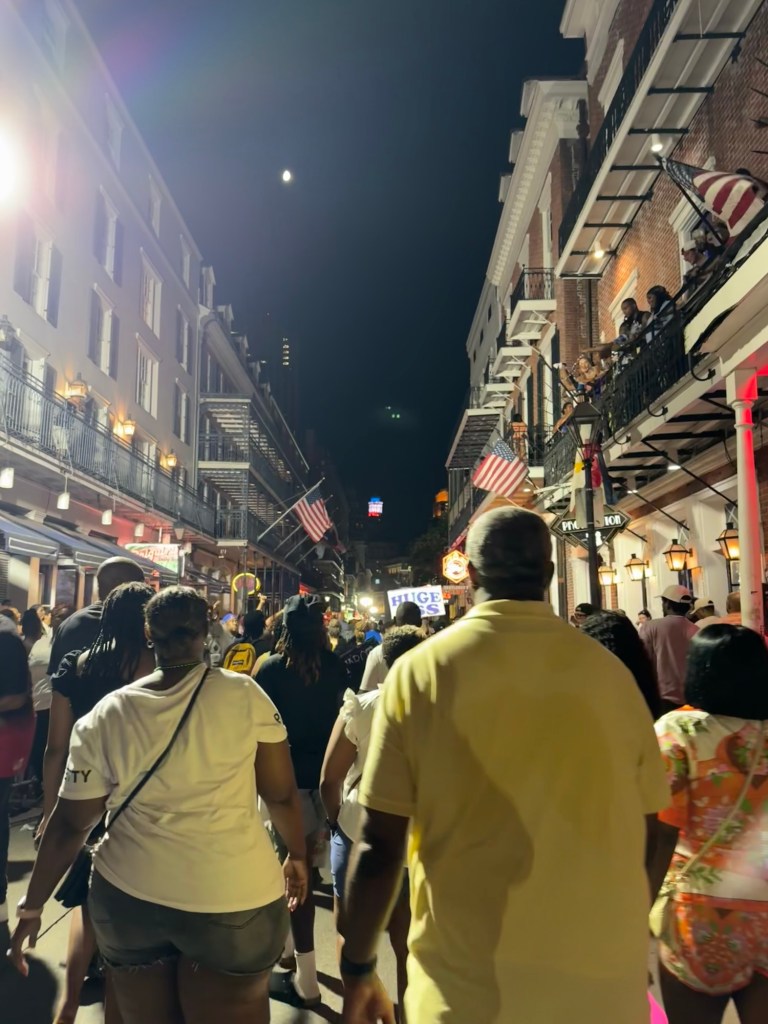 I’ve been here during Mardi Gras season, and since it was summertime, I assumed it wouldn’t be as busy. I was very wrong. The street was buzzing with energy, and bead throwers were still leaning over balconies like it was parade season.