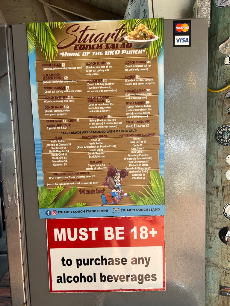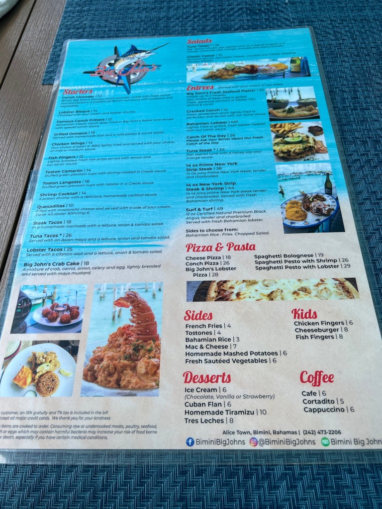 • 🍽️ Conch, Bahamian Lobster, Fried Grouper, Grilled Shrimp, Bimini Bread